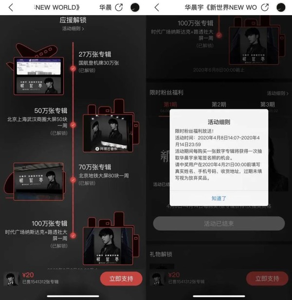 为刺激粉丝消费,平台设置了「应援解锁」和「粉丝福利」。两个活动分别满足群体粉丝和散户粉丝的追星需求。在粉丝看来,通过重复购买多张专辑,既可以更大概率获得爱豆的相关福利奖品,又可以为爱豆解锁平台方出资的应援福利。这种一举多得的事情,让粉丝无形中对销量有了更高追求。