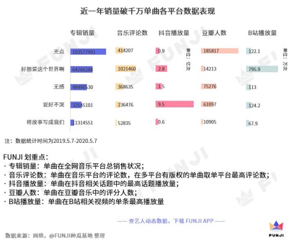 FUNJI整理了近一年销量破千万元的5首单曲在多个平台上的相关数据,发现这5首歌中的多平台数据与单曲销量本身已不存在完全的正相关。