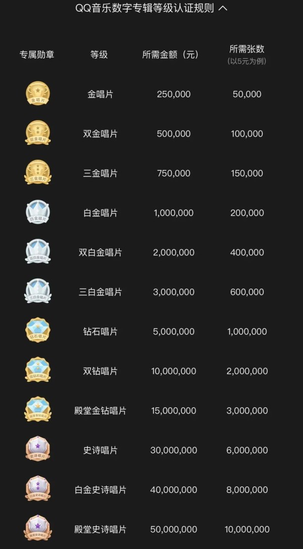 不仅如此,平台还会用销量为标准给数字专辑评级,给销量赋予等级和意义。“白金”、“钻石”、“殿堂”、“史诗”...这些等级明显的荣誉评级就是艺人在音乐作品上的牌面,也是平台用来激励粉丝多买专辑的手段。