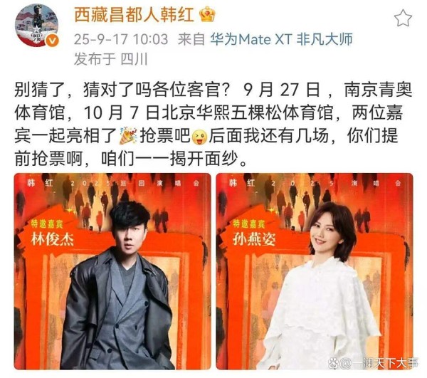 北京,十月的夜场。韩红舞台上点名“孙女士”,说她多年经由韩红爱心慈善基金会匿名捐款已超一千万元,“她总是悄悄地,暖暖地传递着爱心”。台下安静了一瞬,继而掌声起。孙燕姿接话:“我希望你去赈灾的时候是好天气……有一天你会发现,你想成为的人就是你自己。”