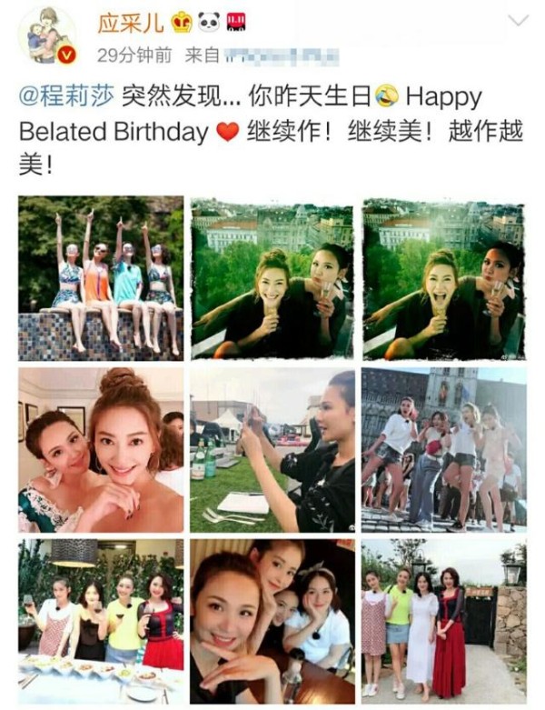 11月9日,应采儿晒出九宫格美照,并配文说:“程莉莎突然发现... 你昨天生日,Happy Belated Birthday ,继续作!继续美!越作越美!”。只有大大咧咧的应采儿会做出这种忘记好友生日,又大方发微博为其补过生日的事。不愧是山鸡哥妻子,大嫂风范儿十足。