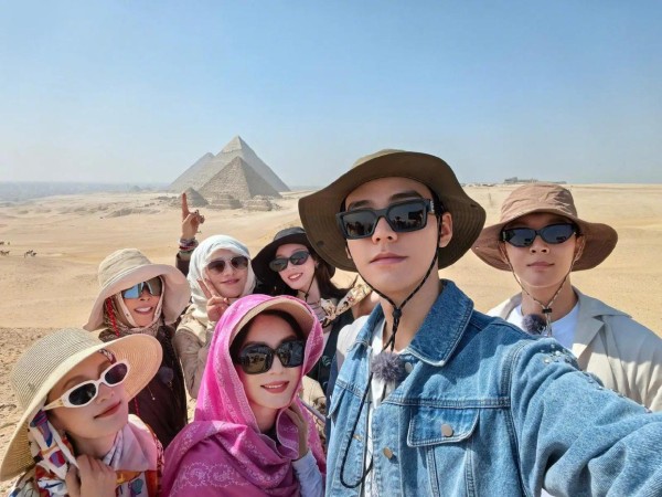 金字塔的合照站位有点挤,大家肩膀不小心碰在一起,镜头正好抓住了那一瞬间的对视