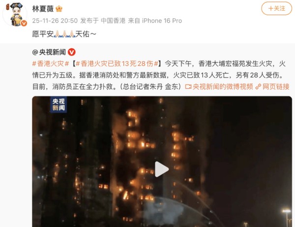 愿香港火灾受灾同胞平安!欧阳震华、奥斯卡等明星纷纷发文祈福