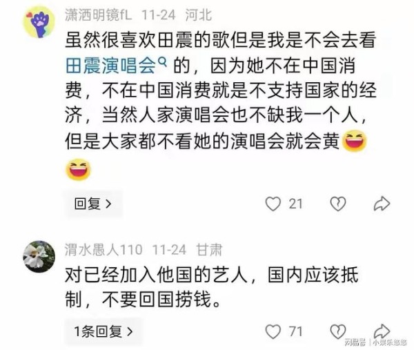 但也有人认为,田震是靠国内平台捧红的,本着饮水思源的原则,她不应该把中国当成取款机,有钱的时候去国外花,没钱的时候回国内捞!
