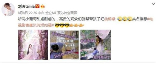 首先是刘涛,刘涛不但是一名知名的演员,还在歌坛有所发展,在《跨界歌王》之中更是以超凡的实力将冠军收入囊中,可谓是娱乐圈的“拼命三娘”了。而跟杨紫的结识是在《欢乐颂》一剧中。当时二人合作演出了这部戏,所以二人必然有着不小的交情,而刘涛也是在杨紫新戏播出之际,微博发文为她宣传,刘涛做事一向一丝不苟,但从她的微博来看,这也只是很普通的为朋友宣传一下而已。