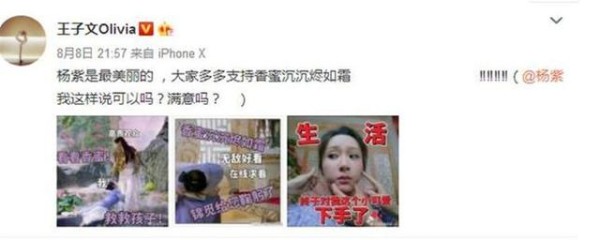 然后要说的就是王子文了,她相比前两位,就显得暴露了很多,首先以十分浮夸的口吻夸了杨紫和她的新戏,后来觉得不够明显,没有明确展示出自己是迫于无奈的这种心情,所以之后又加了一句:我这样说可以吗?满意吗?以此来展现自己的迫于无奈。