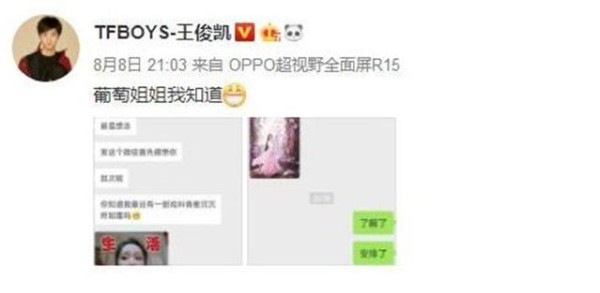 首先是王俊凯,晒出两张微信聊天截图,将杨紫的话和表情包全部发了出来,并且调侃道:葡萄姐姐我知道。就这样简单粗暴的将杨紫吩咐的事安排了,惹来一众笑掉大牙。