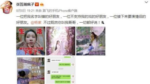 然后是张一山,不光晒出了截图,还将杨紫的威胁和照片也一并丢了出来,并表示自己对杨紫的表情包很反胃。张一山和杨紫作为老相识,经常是在各种节目中同框,见面就是互损,经常惹得大家爆笑不已,还为他们组了“山羊”CP,但后来二人都明确表示没有这回事,并且杨紫的男友也已经公开,所以这一事件也没人再提及。而且在一张截图中,杨紫微信头像也被曝光了。