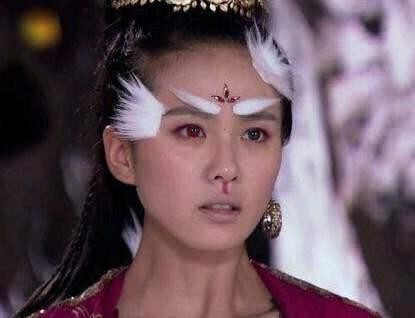 梁咏琪饰演的国师十分夸张,这个衣服还行,没什么大毛病,一身羽毛装有那么一点奇幻的感觉,但是这个头部的装扮就让人想不通了。