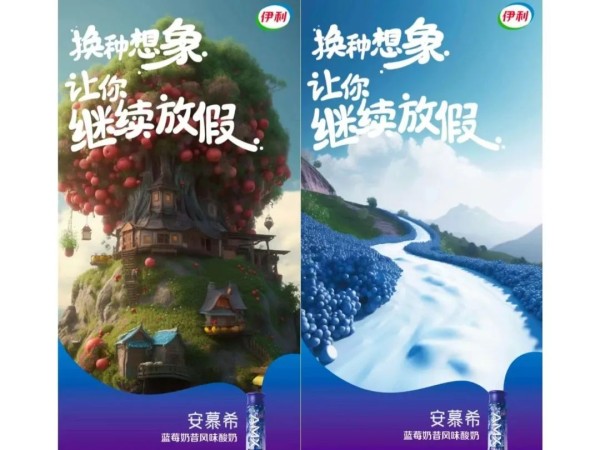 确定了创意方向,我们结合伊利的9个明星产品,将它们的关键元素进行拆分再“投喂”给AI。在短时间内每款产品都生成了3张富有场景感的KV,例如蓝莓酸奶的庄园中,山坡上就充满着新鲜的蓝莓。