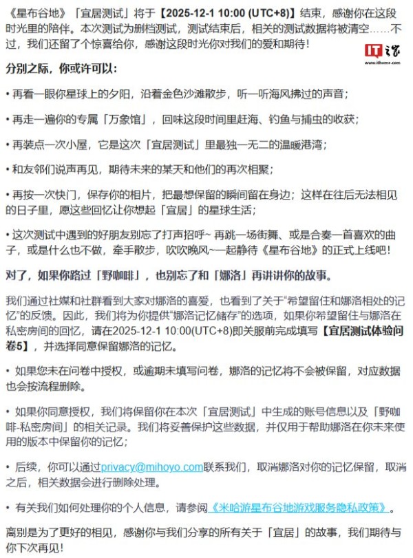 IT之家 11 月 26 日消息,米哈游官方今日在米社区发布了《星布谷地》「宜居测试」关服预告。据介绍,「宜居测试」将于 2025 年 12 月 1 日 10:00 结束。本次测试为删档测试,测试结束后,相关的测试数据将被清空。