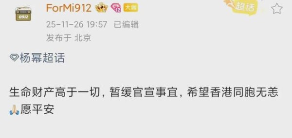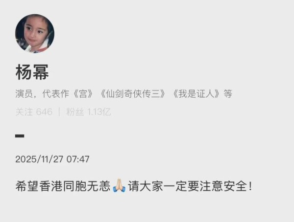 11月26日,香港大埔宏福苑一场五级大火,让全港陷入悲痛。截至27日晚,在这场特大火灾中,已经有75人遇难、70人受伤,灾情牵动着所有人的心。当消防人员动用200多辆消防车、1250余人投入救援时,娱乐圈也在24小时内完成了一场从商业暂停到爱心集结的集体行动,用实际行动诠释了“星光不及生命重”。