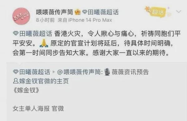 田曦薇把新剧《嫁金钗》的单人海报宣发全延后,承诺“哀悼过后再同步”。