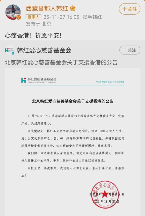 多位明星艺人为香港火灾捐款!韩红周深一马当先,张柏芝捐100万