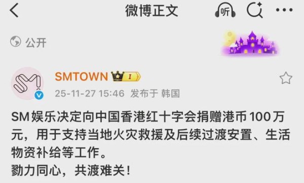 截至11月27日,娱乐圈的援助还在继续,SM的捐款引发对其他韩娱公司的效仿呼吁,企业层面小米、腾讯各捐1000万港元,阿里巴巴捐2000万,安踏捐3000万港元物资。这场灾难像一面镜子,照出了娱乐圈的价值观进化:从前大家比流量比数据,如今更比责任比担当。