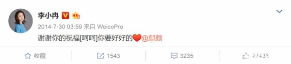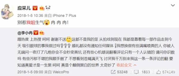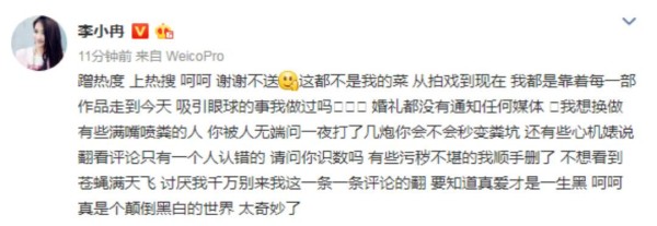 莫名躺枪,经受乌龙闹剧侵扰的她及时发声:“蹭热度,上热搜,呵呵,谢谢不送,这都不是我的菜”,同时她的圈中好友发微博力挺,才将这不大不小的事件平息。