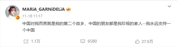 11月18日,日本歌手美依礼芽在个人微博发布:“中国对我而言就是我的第二个故乡,中国的朋友都是我珍视的家人——我永远支持一个中国”。