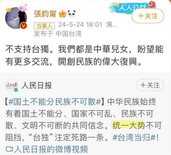 自 3 月 22 日起,吴奇隆、侯佩岑、欧阳娜娜、辰亦儒、汪东城、赖冠霖、张信哲、陈妍希等台湾艺人相继在社交媒体平台发表立场声明。值得关注的是,此次表态呈现出鲜明的范式特征:均以 "中国终将实现完全统一" 为开篇,以 "台湾必将回归祖国的怀抱" 收尾,形成高度统一的表述结构。
