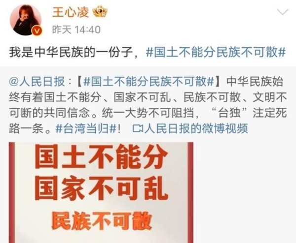 在《乘风破浪的姐姐 4》中凭借回忆杀再度翻红的台湾艺人王心凌,近期因社交平台表态陷入争议漩涡。其发布的 "身为中华民族一份子,倍感骄傲" 文案,虽使用 "中华民族" 这一民族共同体概念,但刻意规避 "台湾属于中国" 的核心表述,与其他台湾艺人普遍采用的 "中国终将实现完全统一" 范式形成鲜明对比。