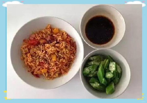 午餐时分,虽然主食有所增加,但配菜依旧保持清淡,以白水煮秋葵为主,偶尔会搭配些蘸料,以满足口味的多样性。