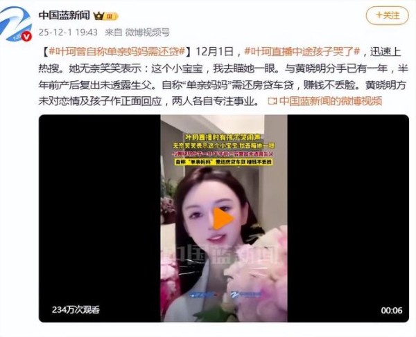 “单亲妈妈”叶珂直播中断哄娃引热议,网友:黄晓明不管么?