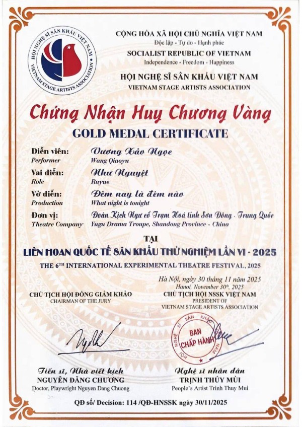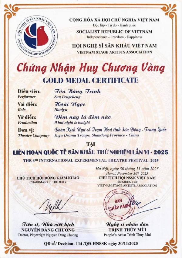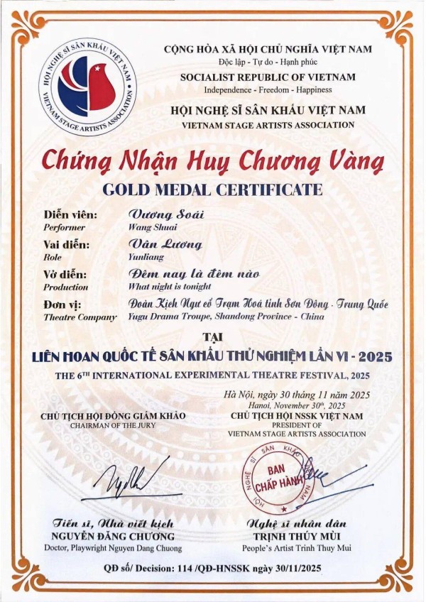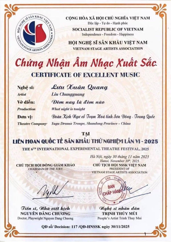 11月30日,从越南举行的2025年第六届国际实验戏剧节传来喜讯,首次走出国门的沾化渔鼓戏《今夕何夕》斩获特等奖,3名主演王巧玉、王帅、孙鹏程分获演员一等奖,《今夕何夕》还获得本届戏剧节唯一的作曲奖。