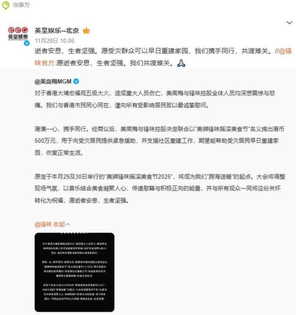 事实上,早在火灾发生的当天,谢霆锋就已经发文为受灾民众祈福,并特别提到了救火英雄的安全。
