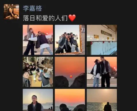 12 月 3 日,李嘉格的一条朋友圈截图在网上流传,截图里她和一名帅哥相依对视画面十分甜蜜,文案 “落日和爱的人们” 也让大家纷纷猜测她有了新恋情。没过多久,李嘉格便在社交平台上主动回应,正式确认了自己的新恋情:“新生活,刚好合拍。”
