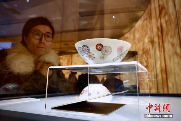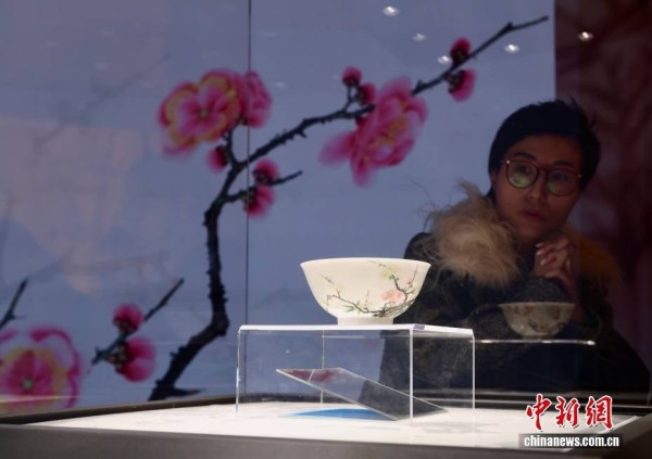 12月5日,保利拍卖二十周年秋季庆典拍卖会第一阶段预展在北京新保利大厦开幕,展出中国古董珍玩、现当代艺术、珠宝钟表共3大门类,逾千件拍品。图为观众参观一对清雍正御制洋彩皮球花碗。中新社记者 易海菲 摄