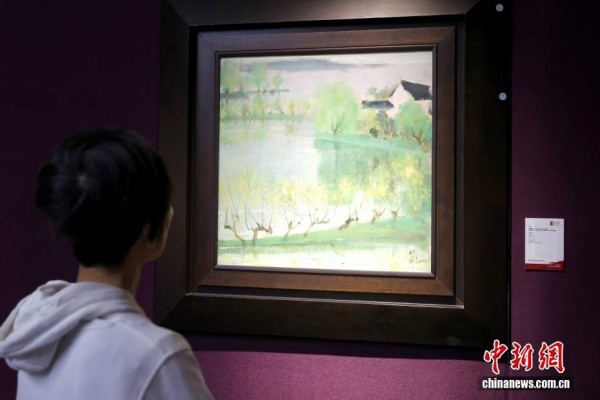 12月5日,保利拍卖二十周年秋季庆典拍卖会第一阶段预展在北京新保利大厦开幕,展出中国古董珍玩、现当代艺术、珠宝钟表共3大门类,逾千件拍品。图为观众观看苏天赐的《江南水乡》。中新社记者 易海菲 摄