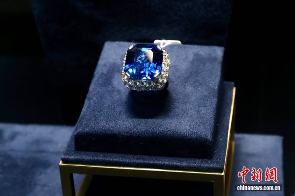12月5日,保利拍卖二十周年秋季庆典拍卖会第一阶段预展在北京新保利大厦开幕,展出中国古董珍玩、现当代艺术、珠宝钟表共3大门类,逾千件拍品。图为大克拉蓝宝石配钻石戒指。中新社记者 易海菲 摄