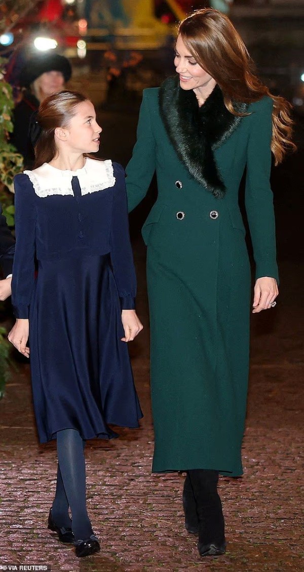虽然凯特和夏洛特一直以来都喜欢穿搭配的衣服,主要是在颜色上保持一致,但今天夏洛特选择了一套与父亲和兄弟们相呼应的海军蓝套装,白色翻领带着复古的美感,而她的母亲则穿着一件惊艳的墨绿色外套,颇具圣诞气息。