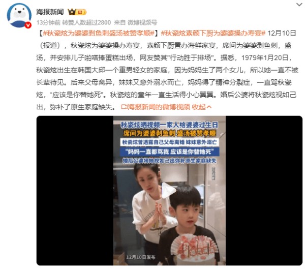 秋瓷炫为婆婆操办寿宴,不仅素颜下厨准备了一桌海鲜家宴,席间还贴心地帮婆婆剥鱼刺、盛汤,更特意安排儿子啪嗒捧着蛋糕登场,网友纷纷称赞她 “行动胜于排场”。