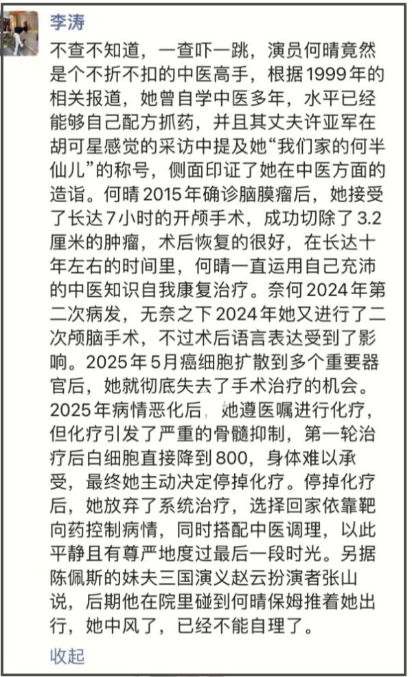 一博主自曝何晴和病魔抗争的过程,称其是2015年确诊,接受开颅手术后一度恢复得很好。无奈2024年再次复发,何晴只能进行第二次手术,可没想到术后语言表达受到了影响。今年5月份,她的癌细胞扩散到多个重要器官后,何晴便彻底丧失了手术机会。最后的时光,她放弃系统治疗,平静且尊严的度过了最后一段时光。