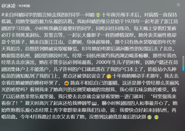可事实上,何晴的烦恼远不止这些。何晴离世后,其老同学也曝出了何晴的更多情况。这位同学称何晴10年前做了开颅手术后,对病情一直保持低调的态度,坚强而充满毅力的活着。