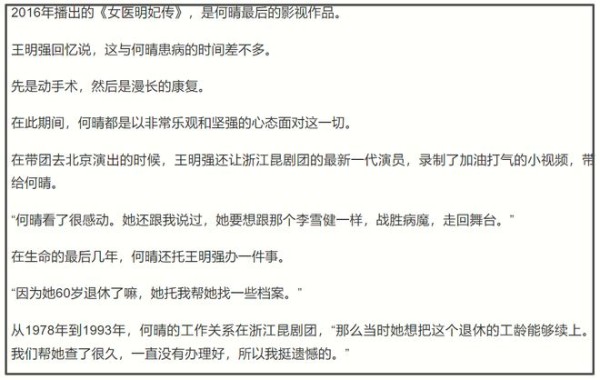 好友王明强也透露,何晴60岁才退休,生命的最后几年还在嘱托他找一些档案。原来何晴的工作关系一直都在浙江昆剧团,她希望能把退休的工龄给续上,可惜一直没能如愿。