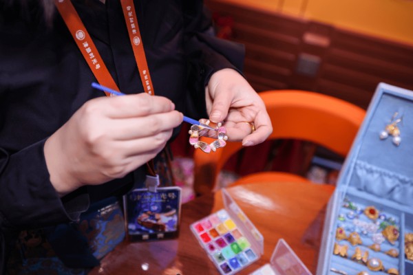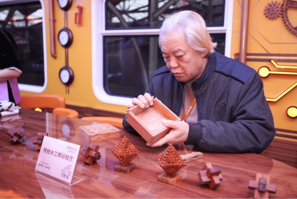 启动活动中,4家特色非遗项目的传承人齐聚车厢,为乘客们带来了精彩纷呈的技艺展示与互动体验。乘客们积极参与,在传承人的指导下,亲手制作了属于自己的非遗作品。杨柳青木版年画展区前,乘客们在现场亲自动手体验木版印制的年画作品,赞不绝口;花丝镶嵌点蓝胸针制作区同样热闹非凡,参与者们精心挑选自己喜欢的颜色,小心翼翼地填充在花丝间的空隙里,每一笔都倾注了对传统工艺的热爱与敬意;观照轩瓷器绘制区域,大家手持画笔,在传承人的指导下,在瓷器上勾勒出各种图案;鲁班锁拼插体验区也聚集了不少爱好者,大家仔细观察鲁班锁的结构,思考着每一块木料的拼插顺序,在拼插过程中感受着古代工匠的智慧和榫卯结构的精妙。