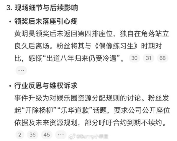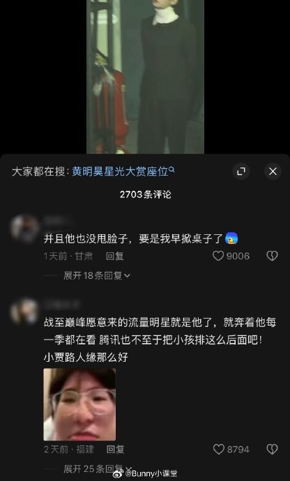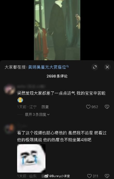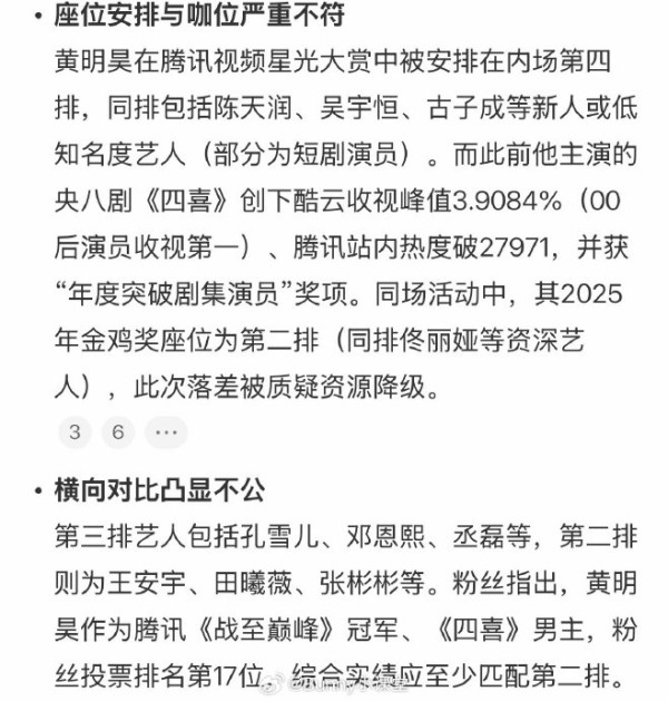 黄明昊在星光大赏的座位引发粉丝不满!黄明昊被安排在内场第四排,和短剧艺人坐在一起……黄明昊坐了一会之后离开座位,工作人员多次沟通后他才重新落座。有的人认为以黄明昊的热度不至于安排在第四排,也有人认为黄明昊出道多年仍没有代表作,坐在第四排合情合理,大家怎么看