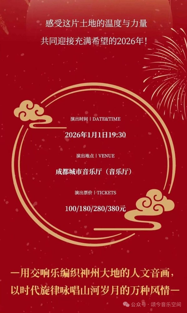2026年1月1日晚,由著名作曲家吴颂今领衔,郑阳、徐可等青年作曲家共同编创的《神州音画》管弦乐组曲新年音乐会,将在成都城市音乐厅奏响。元旦之夜,这部被誉为“中国版交响诗”的“现象级”作品,将由籁之音爱乐乐团演奏。