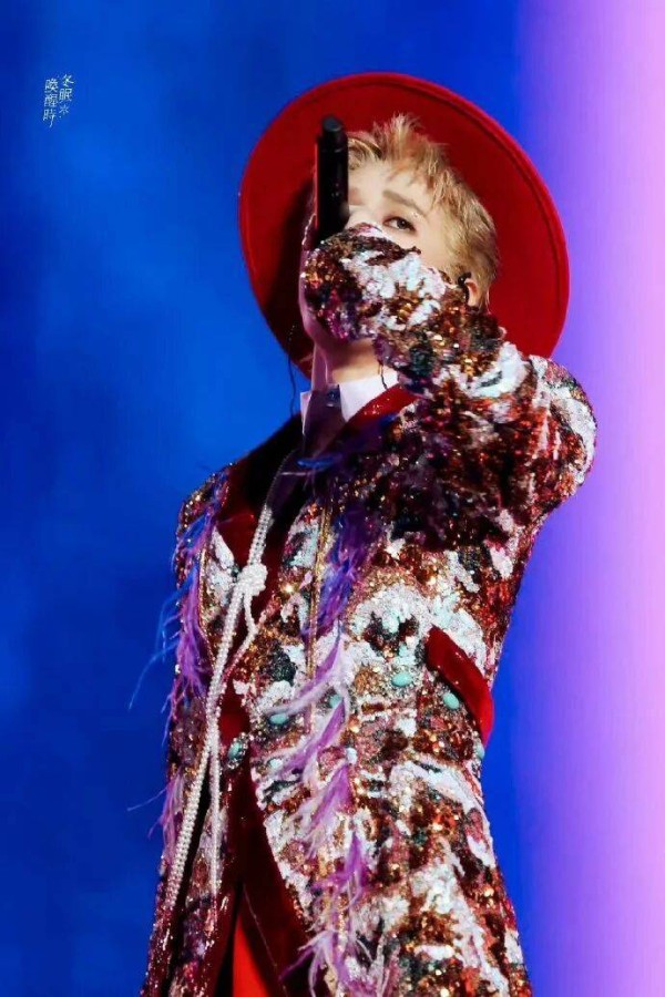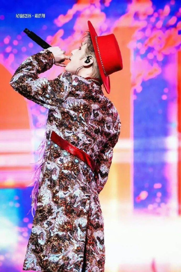 没人规定亮片礼服只能是柔美的闪,他的礼服裹着美式前刺的锐:礼帽压在发顶的弧度,不是复古的端,是 “顶起礼帽” 的野性;珍珠链条绕在领间,不是柔的贵,是和他舞台动作的硬撞出的 “反差锐”。抬手时亮片的光顺着动作流,不是静态的闪,是 “气场带着光动”—— 每片亮的节奏,都跟着他的舞台力度走,这是严浩翔独有的 “亮片掌控力”,不是任何礼服能自带的。