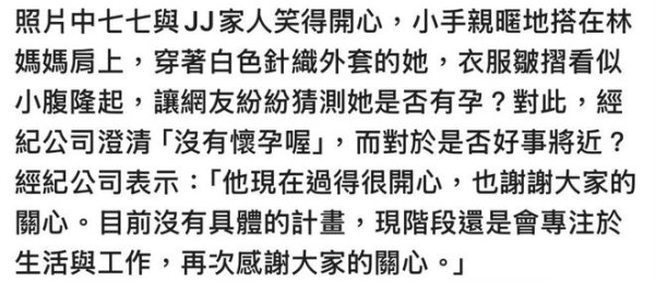 对此,林俊杰的经纪公司也发声否认,表示林俊杰的女友并没有怀孕,至于是否好事将近,公司称他(林俊杰)过得很开心,也感谢大家的关心,目前还没有具体的计划,现阶段还是会专注于工作与生活。