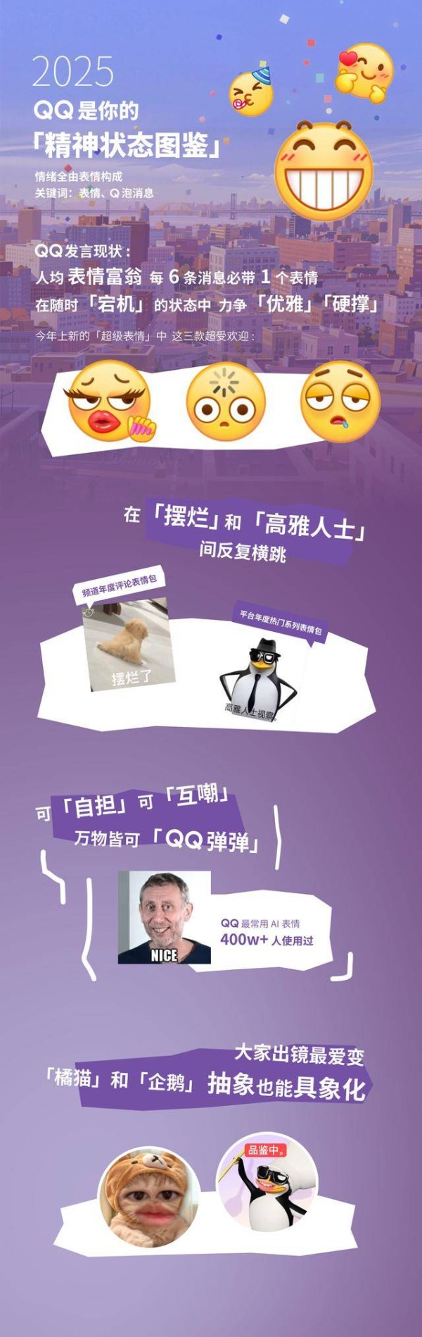 报告指出,QQ聊天界面已成为一座“视觉情绪博物馆”。平均每发送6条消息就有1条附带表情包,“表情富翁”成为普遍社交身份。年度现象级表情如「宕机」「优雅」「硬撑」等,成为年轻人标注日常状态的情绪徽章。