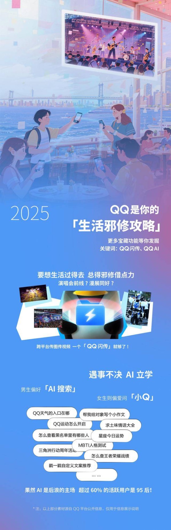 年轻用户善于以“邪修”智慧活用QQ功能解决实际问题。在演唱会、漫展等场景,“QQ闪传”成为跨平台极速传输高清素材的利器。AI功能也深度融入日常,超过60%的AI活跃用户为95后,他们通过AI搜索、对话机器人“小Q”进行学习、创作与情绪梳理。