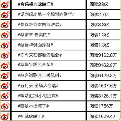 除了最近不断推出的线上直播,微博在2019年就已经开始尝试演出方面的推广营销。其中微博联合咪咕呈现的#音乐盛典咪咕汇#相关话题总阅读量60亿+,五月天、蔡徐坤等话题频登热搜榜。