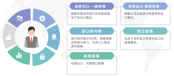 积木式的业务模块组合解决外贸行业常见的一般贸易、囤货贸易、进口转内销、加工贸易以及代理进出口应用场景