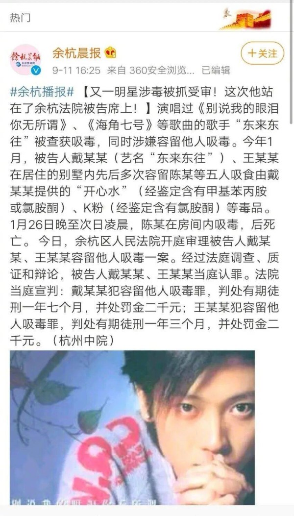 东来东往,本名戴恩泽,曾是20年前的知名歌手,成名曲如《别说我的眼泪你无所谓》、《连哭都是我的错》以及《海角七号》都曾获得广泛喜爱。然而,他的事业渐渐下滑,早已过气。2019年前后,他卷入了毒品事件,不仅自己吸毒,还和朋友一起在自己的别墅中吸毒。更令人震惊的是,他不仅容忍朋友在自己家里吸毒,还涉及到其他更严重的毒品行为,甚至发生了因毒品导致的死亡事故。