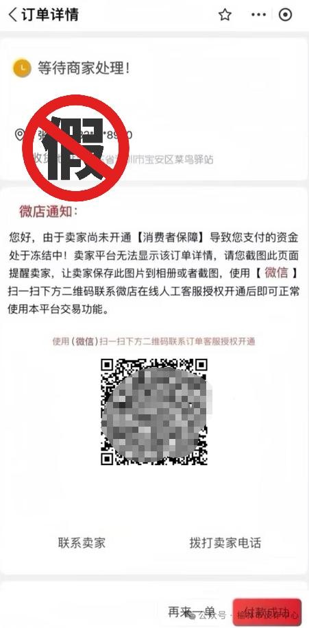 诈骗分子以购物需求为诱饵,提出在指定平台交易。随后伪造“未开通保障”等虚假截图,通过二维码推送仿冒官方的假客服入口,以“解冻资金后才能完成交易”为由制造恐慌。