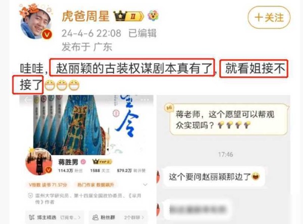 蒋胜男,这位编剧不仅因《芈月传》等剧本闻名遐迩,她还是一位全国人大代表,一直积极在女性权益保护和打击盗版上发声。当蒋胜男收到粉丝的私信时,她表达了愿意写剧本的想法,但也强调了需要双方都有意向的重要性。可这位粉丝似乎没能完全理解蒋的回复,坚持要求她主动出击。蒋胜男则直言不讳地回复说,赵丽颖如果有意合作,可以直接联系她。
