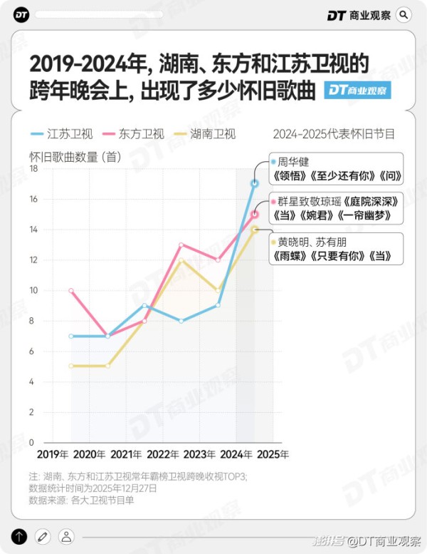 《DT商业观察》统计了湖南卫视、东方卫视和江苏卫视(这三个卫视的收视率常年霸榜卫视跨晚TOP3)2019年-2024年的跨晚节目单,数据显示,“怀旧歌曲”的数量在最近5年飞速增长,并在去年达到了顶峰。
