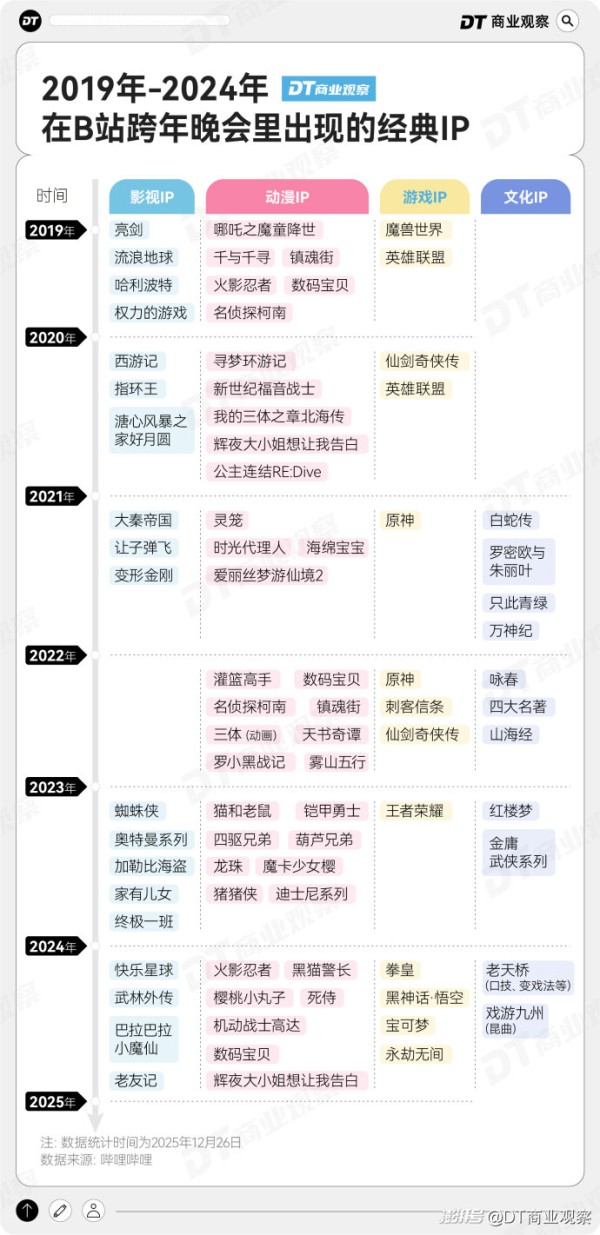 我们统计了2019年到2024年B站跨晚出现的经典IP,发现从第一届跨年晚会开始,经典IP就是B站跨晚的重要组成部分,2019年就有12个经典IP,横跨影视、动漫和游戏三大领域。